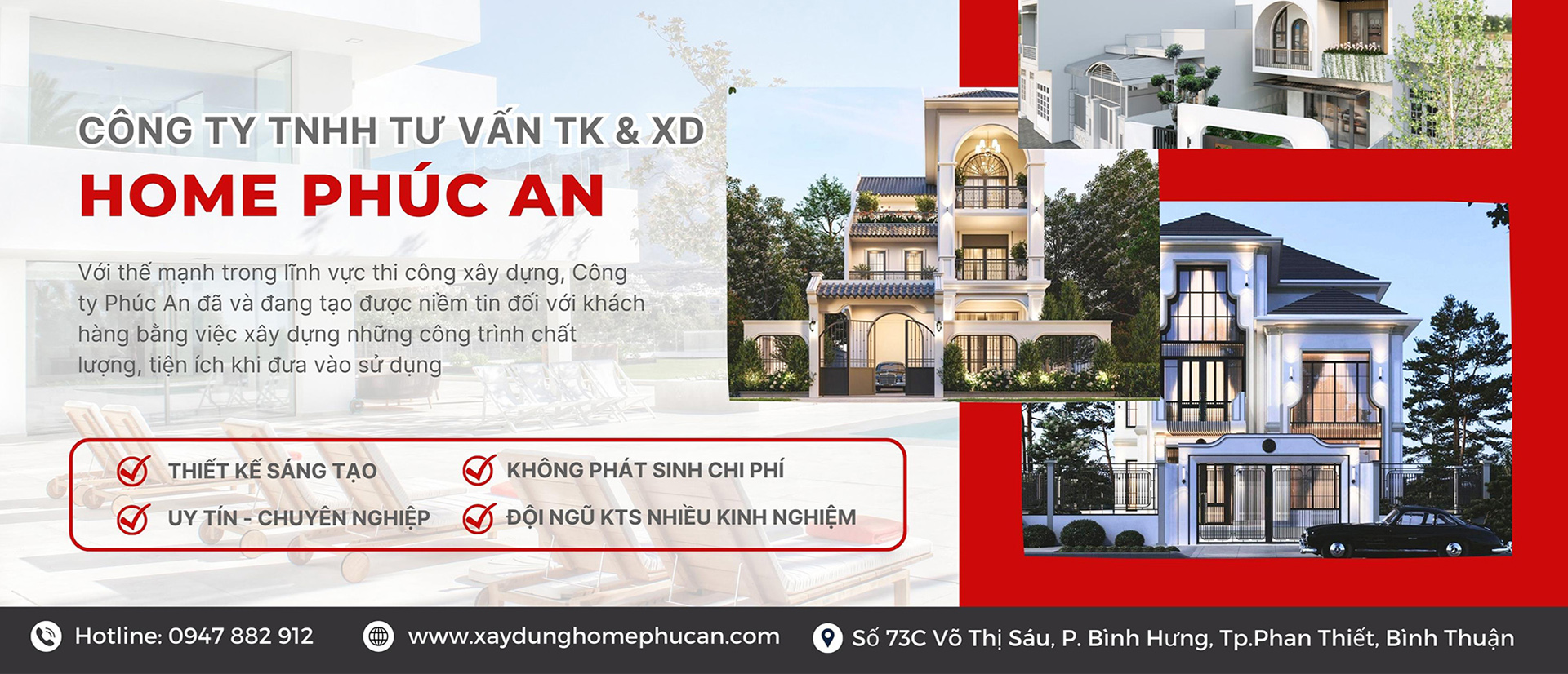 CÔNG TY TNHH TƯ VẤN TK & Xây Dựng HOME PHÚC AN là công ty chuyên Thiết Kế và Xây Dựng công trình nhà ở dân dụng, nhà phố, biệt thự, .. và cung cấp các mặt hàng phụ Vật liệu xây dựng uy tín, chất lượng ở Bình Thuận.