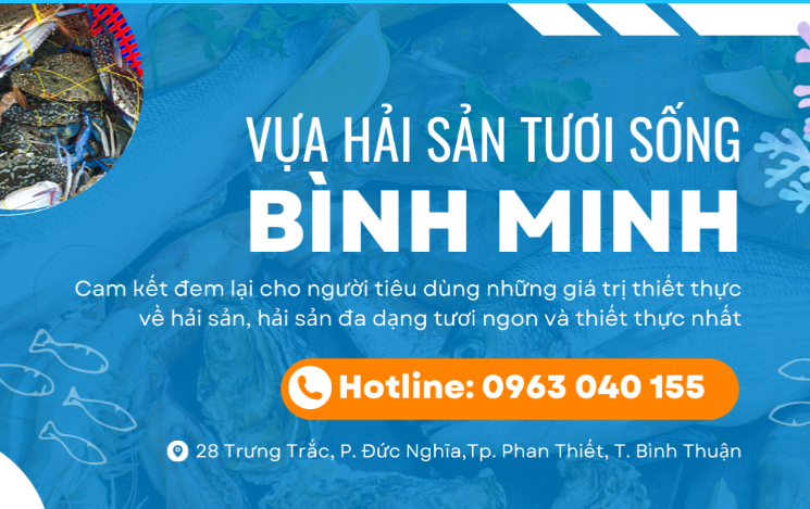 Hải sản tươi sống Phan Thiết - Vựa hải sản BÌNH MINH với lợi thế gia đình có truyền thống làm nghề gia công hải sản, được trang bị máy móc hiện đại giúp cho việc xử lý, lọc loại, gia công bảo quản, vận chuyển và duy trì hải sản luôn ở trạng thái tươi sống tự nhiên, chất lượng tốt nhất khi đến tay người tiêu dùng.